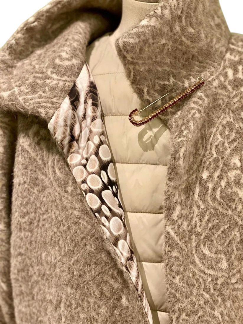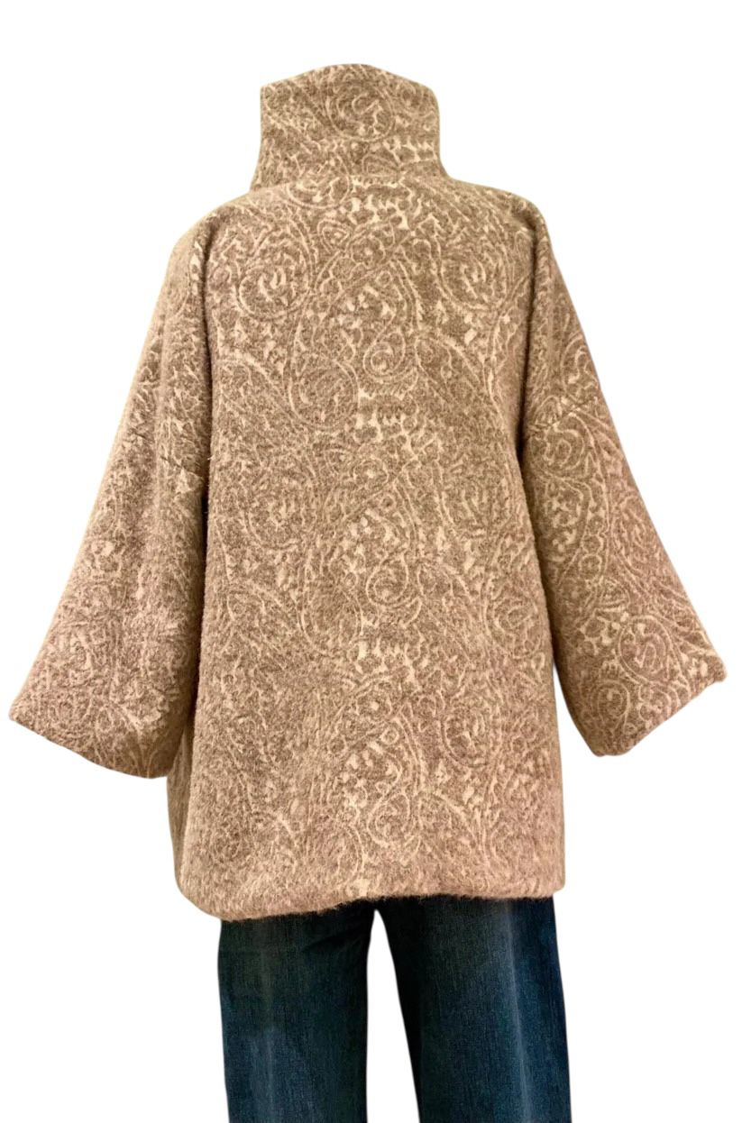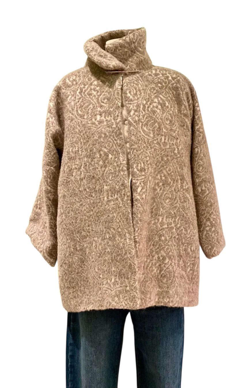 Caban in panno di lana jacquard, taglia unica, perfetto come capospalla da usare da solo o anche con un piumino 100 gr. E' un capo molto versatile da tenere aperto o da chiudere con una spilla (che troverete vicino al vostro caban), confortevole ma sofisticato darà un tocco chic a qualsiasi look.
