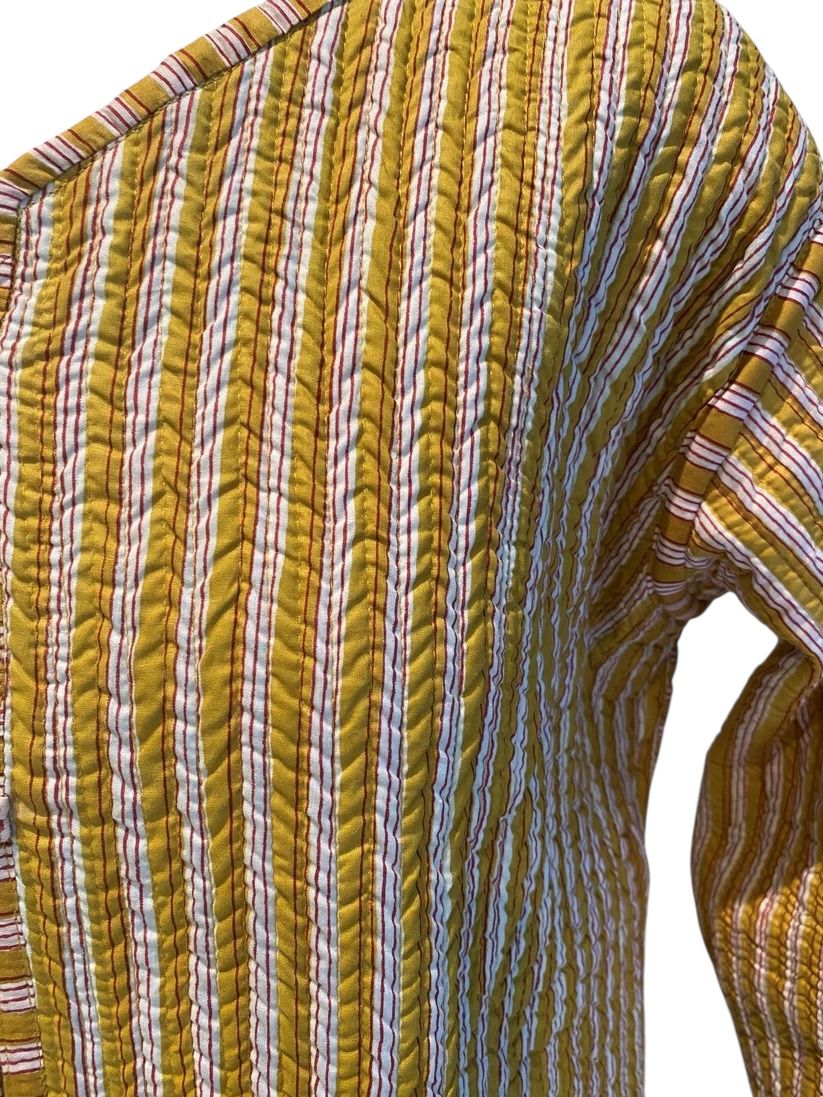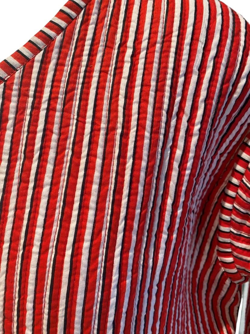 Veste réversible ornée de l'imprimé emblématique Toile de Jouy, inspiré du thème bucolique. l'intérieur présente un imprimé rayé toujours en harmonie avec les couleurs de l'extérieur. Coupe oversize, légèrement col V.