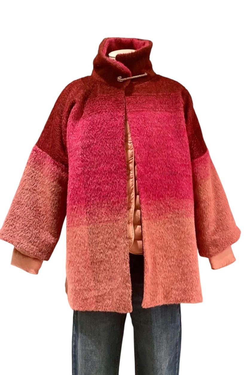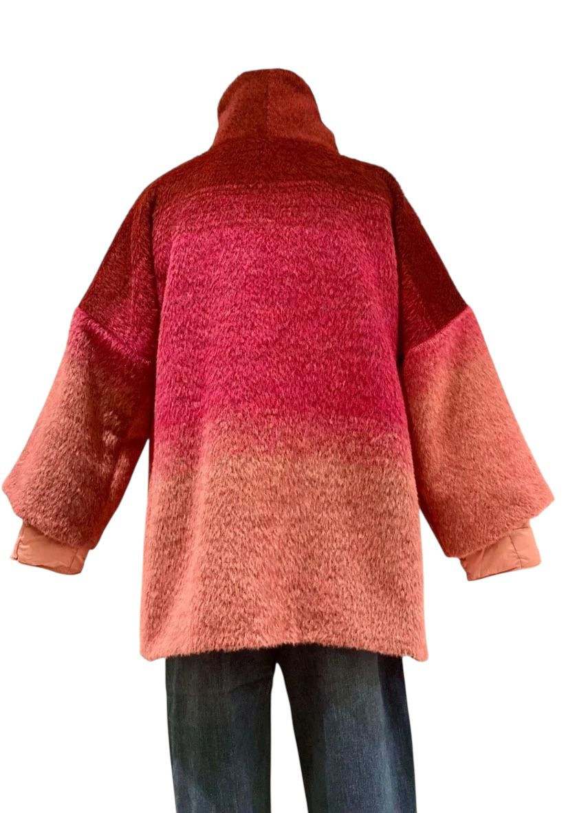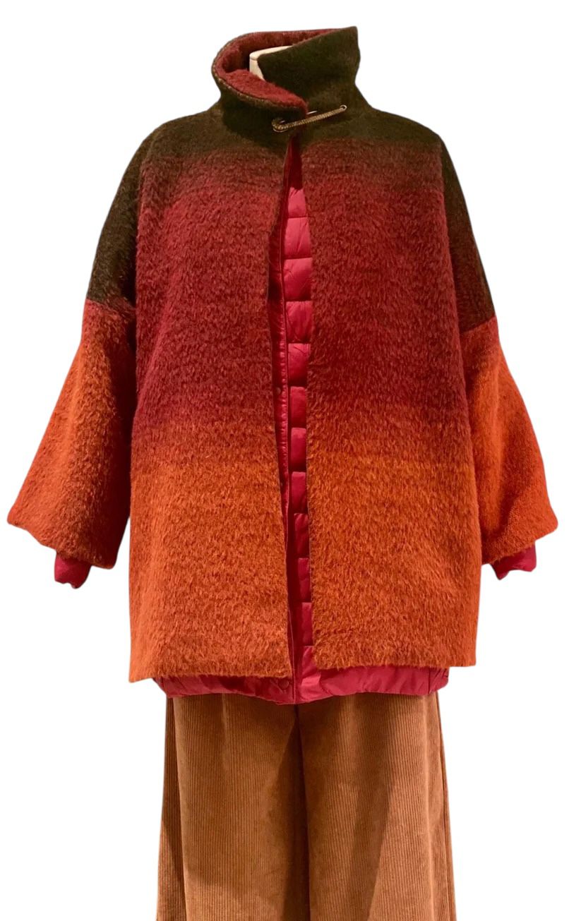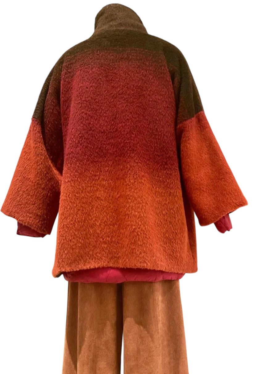 Caban in panno di lana degradè, taglia unica, perfetto come capospalla da usare da solo o anche con un piumino 100 gr. E' un capo molto versatile da tenere aperto o da chiudere con una spilla (che troverete vicino al vostro caban), confortevole ma sofisticato darà un tocco chic a qualsiasi look.