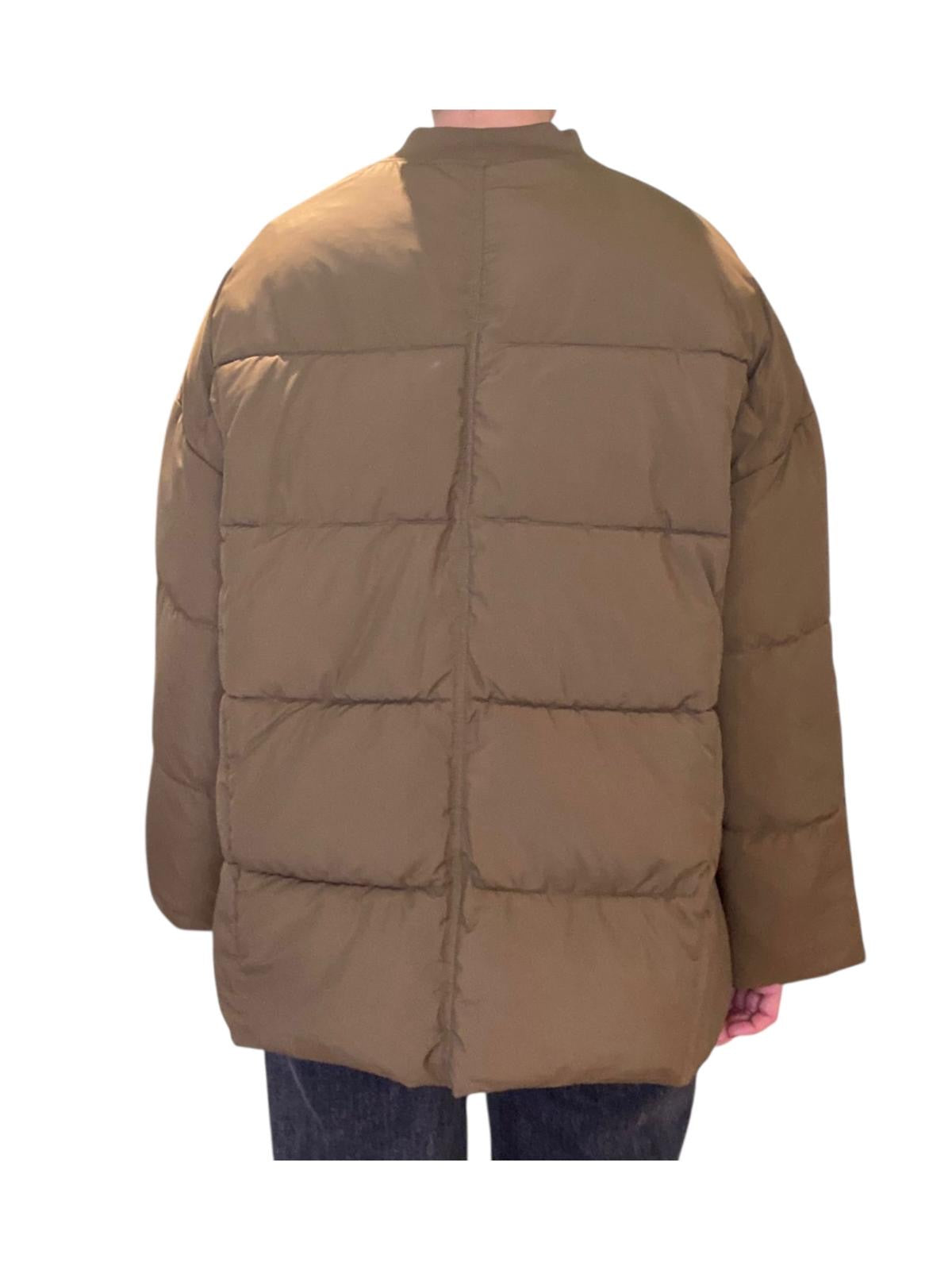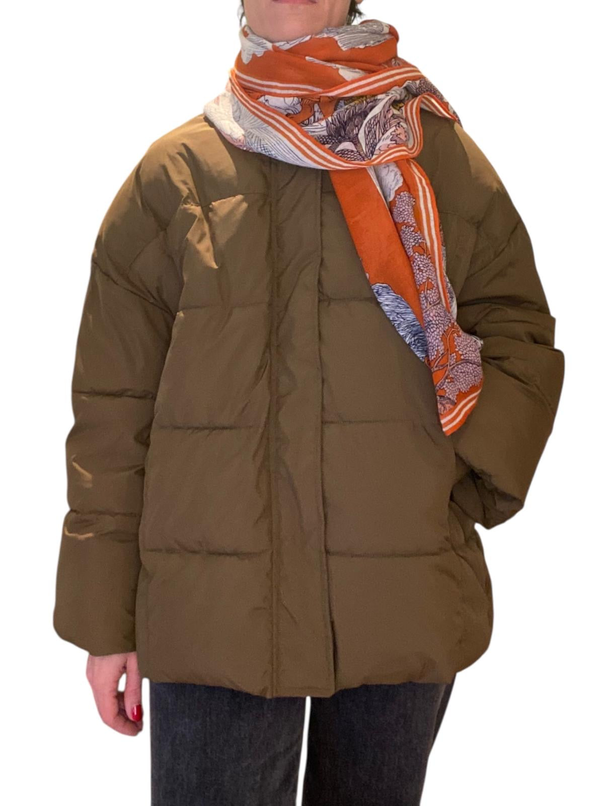 Piumino col kaki, modello boxy, vestibilita comoda dotato di zip e bottoni automatici. Polsino in maglia. Caldissimo per la stagione più fredda!